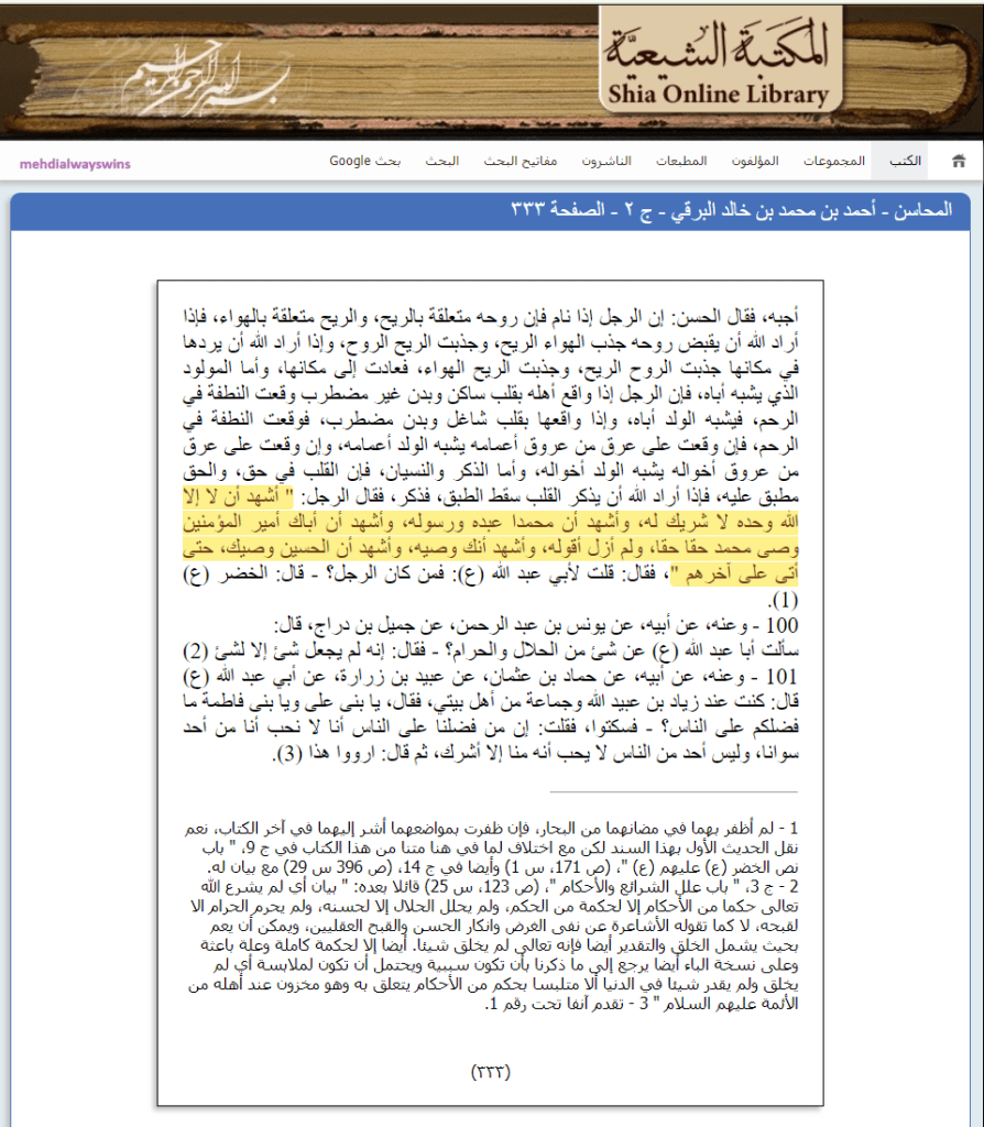 Now, what is interesting about this hadith is the chain of the narrators (the isnad) of this hadith. One of the narrator of this hadith by the name of Ahmed ibn Muhammad al Barqi. What is very fascinating about this is that Muhammad al Barqi wrote a book that still exists to this day called Kitab al Mahasin. Al Barqi died fifty years before Khulayni and his Al Kafi. In this book, we find the hadith that is mentioned in Al Kafi (above), that Ahmed bin Muhammad bin Khalid is providing the hadith of abu Hashim Dawud ibn al-Qasim al-Ja‘fari in which al Khidr goes to Ali (AS) and asks him the same three questions that are asked in Al Kafi, however, after Ali (AS) gives the answers, Al Khidr says to Imam Hasan (AS):