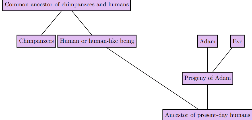 Those who reject the concept of macroevolution at the level depicted in this diagram often overlook the possibility that Adam’s descendants could have interbred with human-like beings who evolved from the common ancestor shared with chimpanzees. This diagram illustrates the theory that all present-day humans not only share a common ancestor with chimpanzees but could also be descendants of a parentless couple (Adam and Eve) created independently. This diagram is compatable with every Hadith and Quranic verse surrounding Adam and Eve.